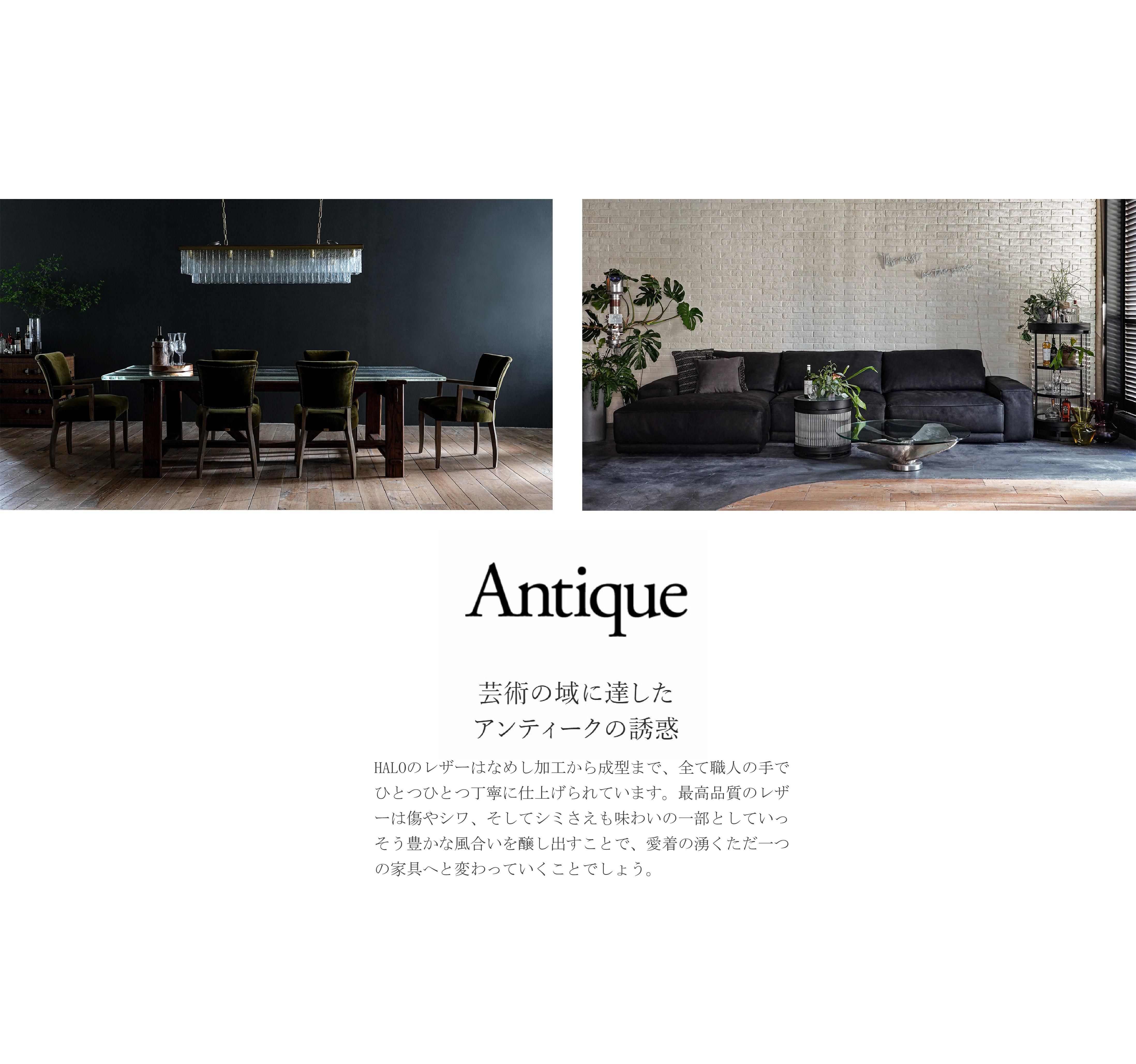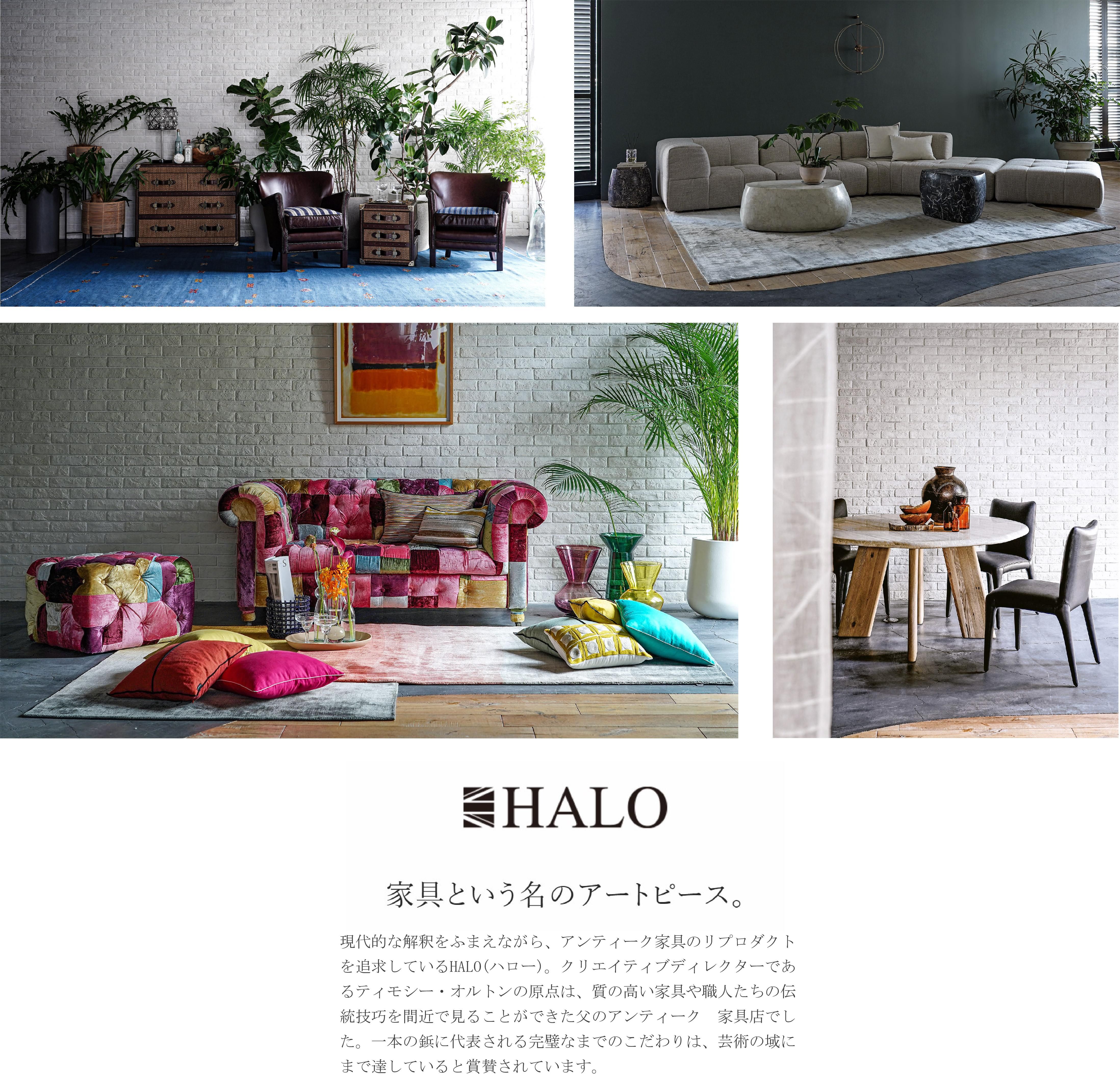 HALO(ハロ−)1976年に英国でフィリップ・オルトン少佐によって設立された、最先端の家具ブランド。「HALOアンティーク」と呼ばれるヴィンテージ風の仕上げの家具を得意としています。