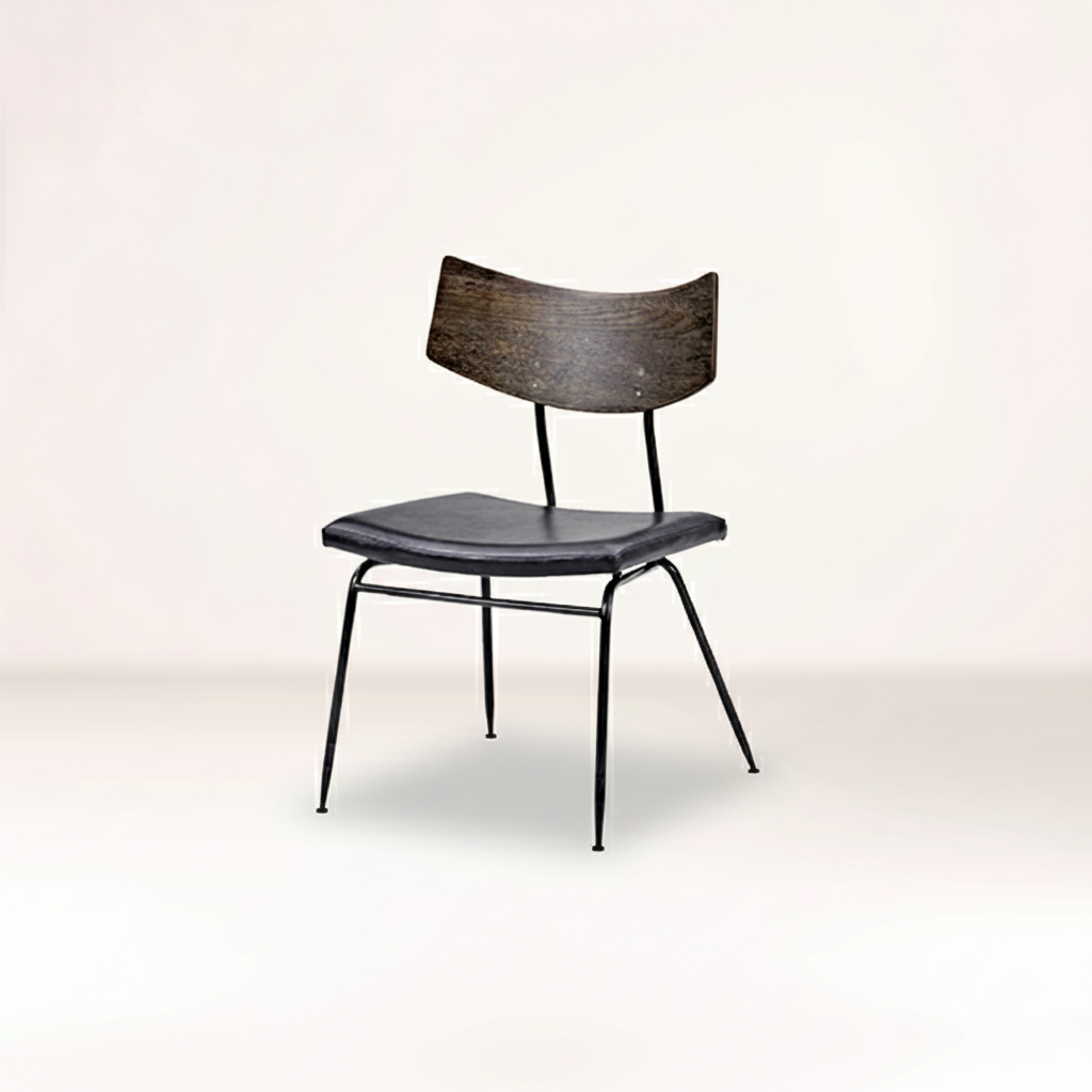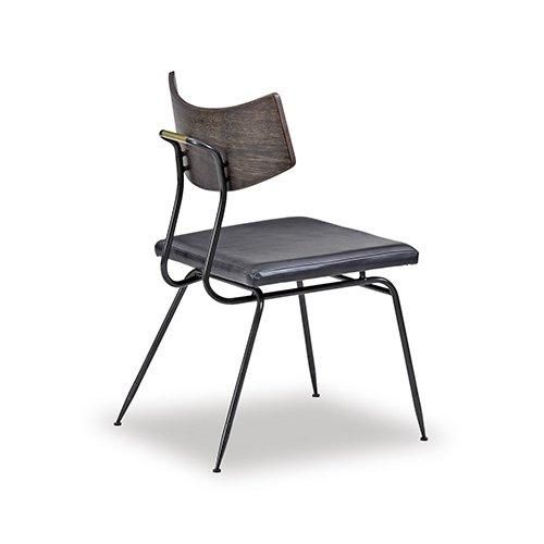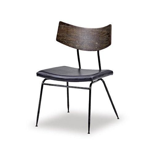 細身のスチール脚がシャープな印象のダイニングチェア。 緩やかなカーブを描く背が身体を包むように支えます。