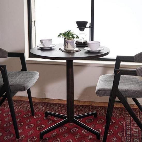 ご自宅用はもちろん、店舗や事務所のカフェスペースなどにも気軽に設置できるカジュアルなラウンドテーブル。 天板材はヴィンテージ感のある艶やかで落ち着いた色合いです。 脚部のベースは無骨な表情の鋳鉄で作られた重厚感の漂う雰囲気で、インダストリアルな中にもモダンな要素が含まれたデザインになっています。
