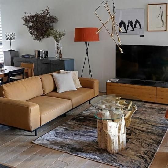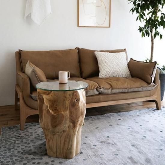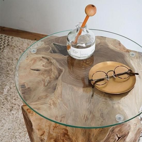 横から見た力強い表情、ガラス天板越しに覗く年輪の美しさなど、 見る角度によって表情が変わるのも魅力のひとつです。 そのままサイドテーブルだけで使うのも良いですが、TOOR COFFEE TABLEと並べてコーディネートすると、空間にリズムが生まれておすすめです。