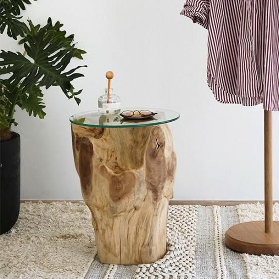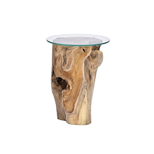 インドネシアジャワ島の古い建物や倉庫に使用されていたチークウッドを贅沢に切り取り、ガラス天板と合わせたTOOR SIDE TABLE。 木がもつ自然の形そのものを活かして仕上げているため、ひとつとして同じ色・同じ形のものがありません。