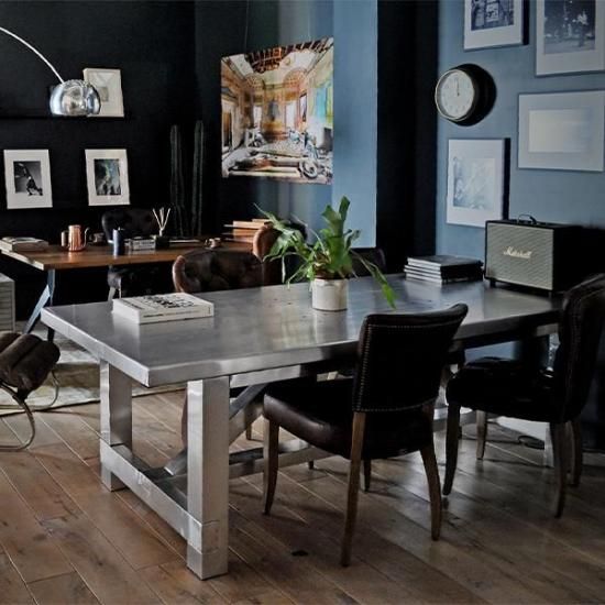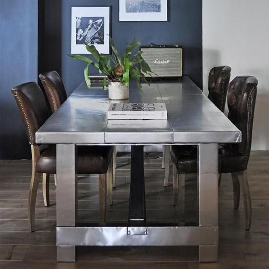 シルバーのメタリックな輝きをまとうアルミ素材「エアロ」を天板に使用したダイニングテーブルです。飛行機のボディをイメージして開発されたエアロは、光沢のある金属感を美しく主張し、その存在感はインテリアとして空間を引き締めます。