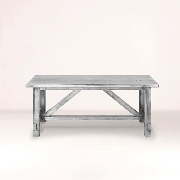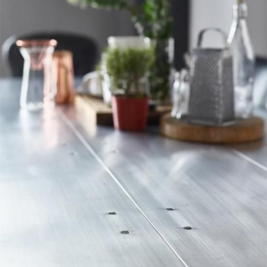 シルバーのメタリックな輝きをまとうアルミ素材「エアロ」を天板に使用したダイニングテーブルです。飛行機のボディをイメージして開発されたエアロは、光沢のある金属感を美しく主張し、その存在感はインテリアとして空間を引き締めます。