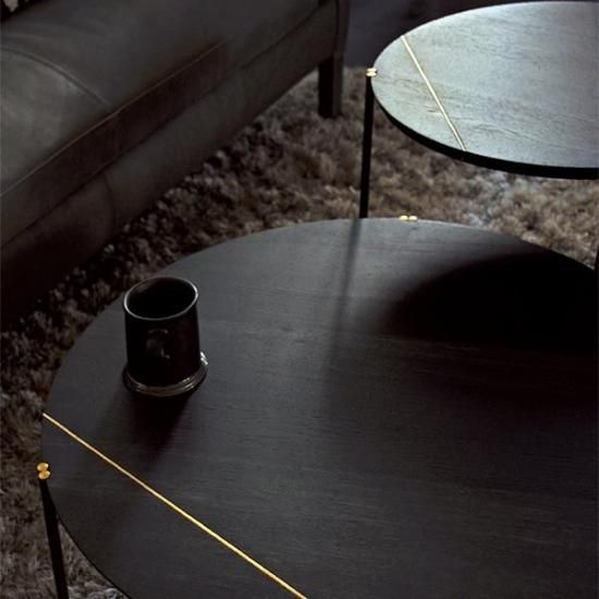 オークに真鍮のインレイ(はめ込み細工)で描かれたラインが美しい円形テーブル。 天板だけでなくフレームの先端にもブラスの輝きをあしらい、テイストの垣根を越えてお使いいただける一台となっています。