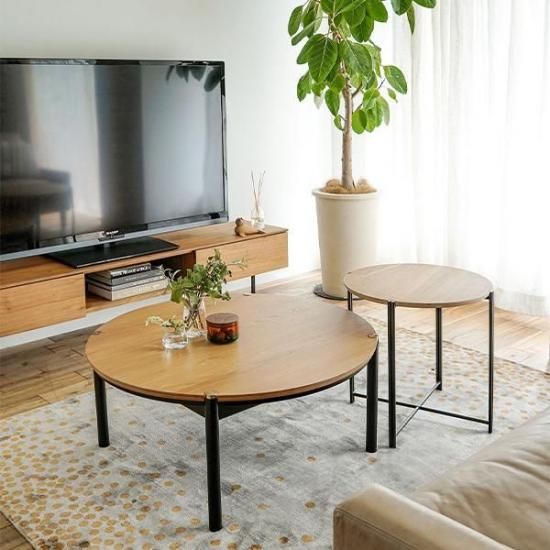 オークに真鍮のインレイ(はめ込み細工)で描かれたラインが美しい円形テーブル。 天板だけでなくフレームの先端にもブラスの輝きをあしらい、テイストの垣根を越えてお使いいただける一台となっています。
