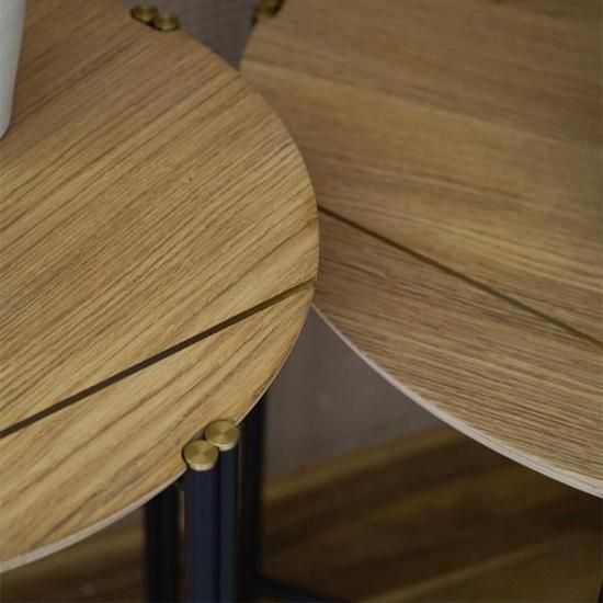 無垢オークにインレイ(はめ込み細工)で描かれたラインが美しい円形テーブル。 天板だけでなくフレームの先端にもブラスの輝きをあしらい、テイストの垣根を越えてお使いいただける一台となっています。