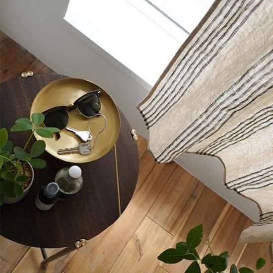 無垢オークにインレイ(はめ込み細工)で描かれたラインが美しい円形テーブル。 天板だけでなくフレームの先端にもブラスの輝きをあしらい、テイストの垣根を越えてお使いいただける一台となっています。