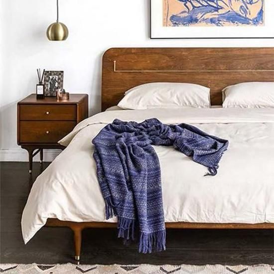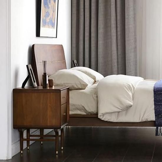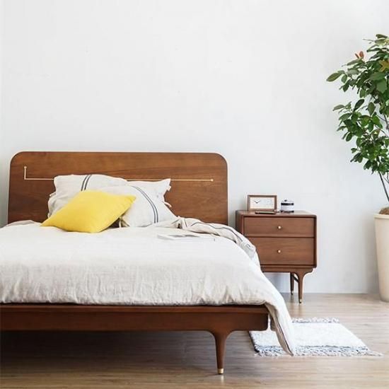 ヘッドボードに真鍮パーツをあしらい、幾何学的なデザインを施したシンプル且つユニークなベッドフレーム。 赤みがかったポプラ材の木目は、柔らかく温かみがあり真鍮パーツとの相性が目を引きます。