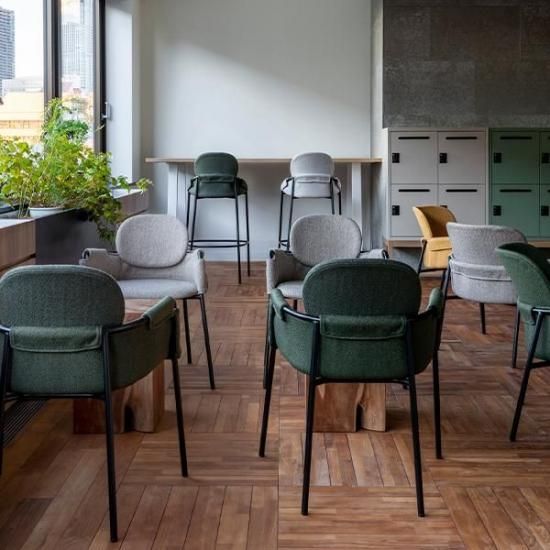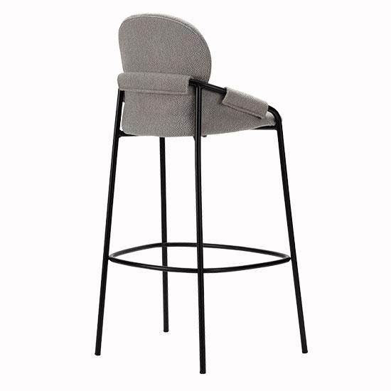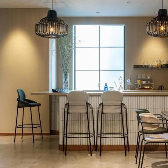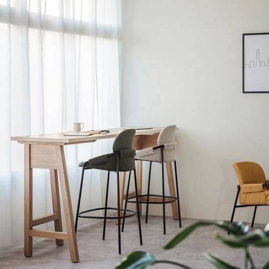 スリムなブラックのスチール脚と張地を施したシートが、スタイリッシュな印象のバースツールです。柔らかなカーブを描く背もたれが、身体を包み込むようにサポートし、安定した座り心地を実現します。 シンプルでシックなデザインなので、オフィスでのカジュアルなミーティングスペースやコミュニティスペースに最適です。