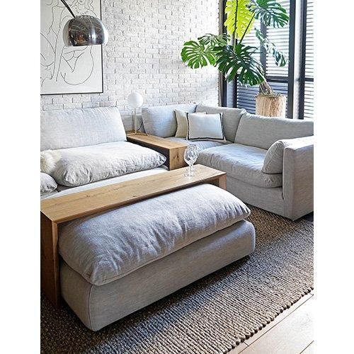 圧倒的なスケールを誇る存在感と上質な印象は、誰しもを魅了し、ラグジュアリーな空間を演出します。しっかりと織り込まれた厚手で肌触りの良い自然素材のファブリックと、たっぷりのフェザーを混入した柔らかなクッション材が、そこに座る人をゆったりと優しく包みこみ、安らぎの世界へといざないます。
