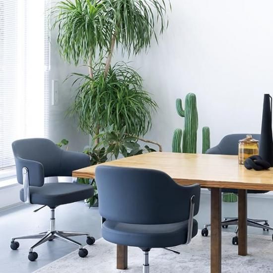 張地にはビニールレザーを使用。 一見レザーのような上質な見た目でありながら、耐水性が高く汚れにくいので気軽にお使い頂けます。 インテリア性の高さを活かして、ミーティングスペースへの配置がおすすめですが、安定した座り心地なので、長時間のデスクワークでも疲れにくい作りになっています。