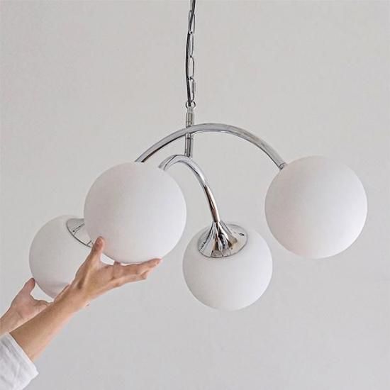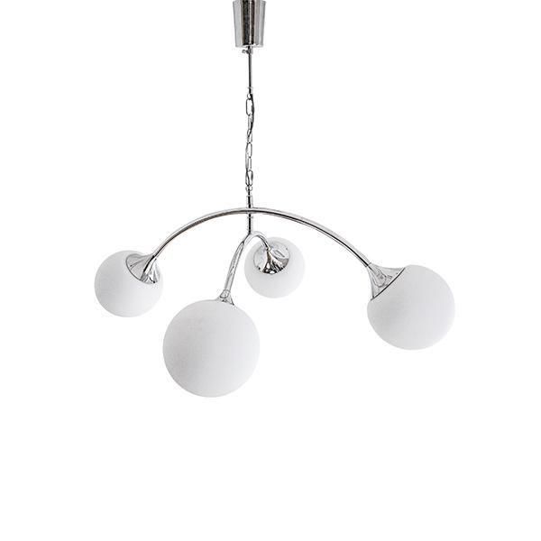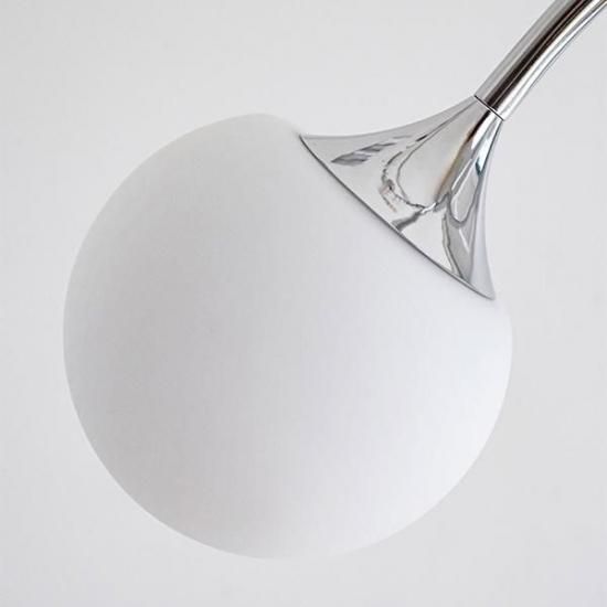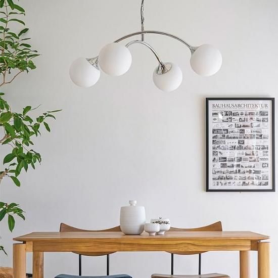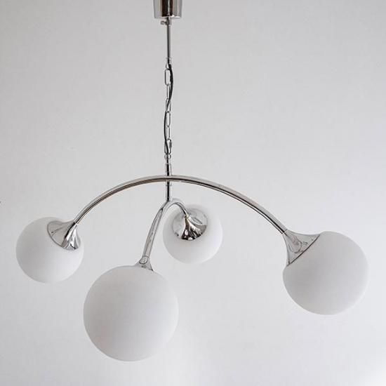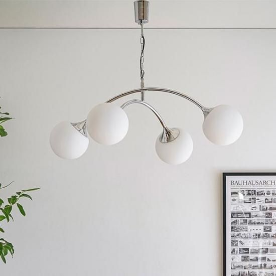 まるで光の軌跡を描くような、洗練されたデザインが魅力のシーリングランプ。 広がるアーチ形状と球体デザインの組み合わせは、1960年代に流行した“スペースエイジデザイン”を彷彿とさせます。